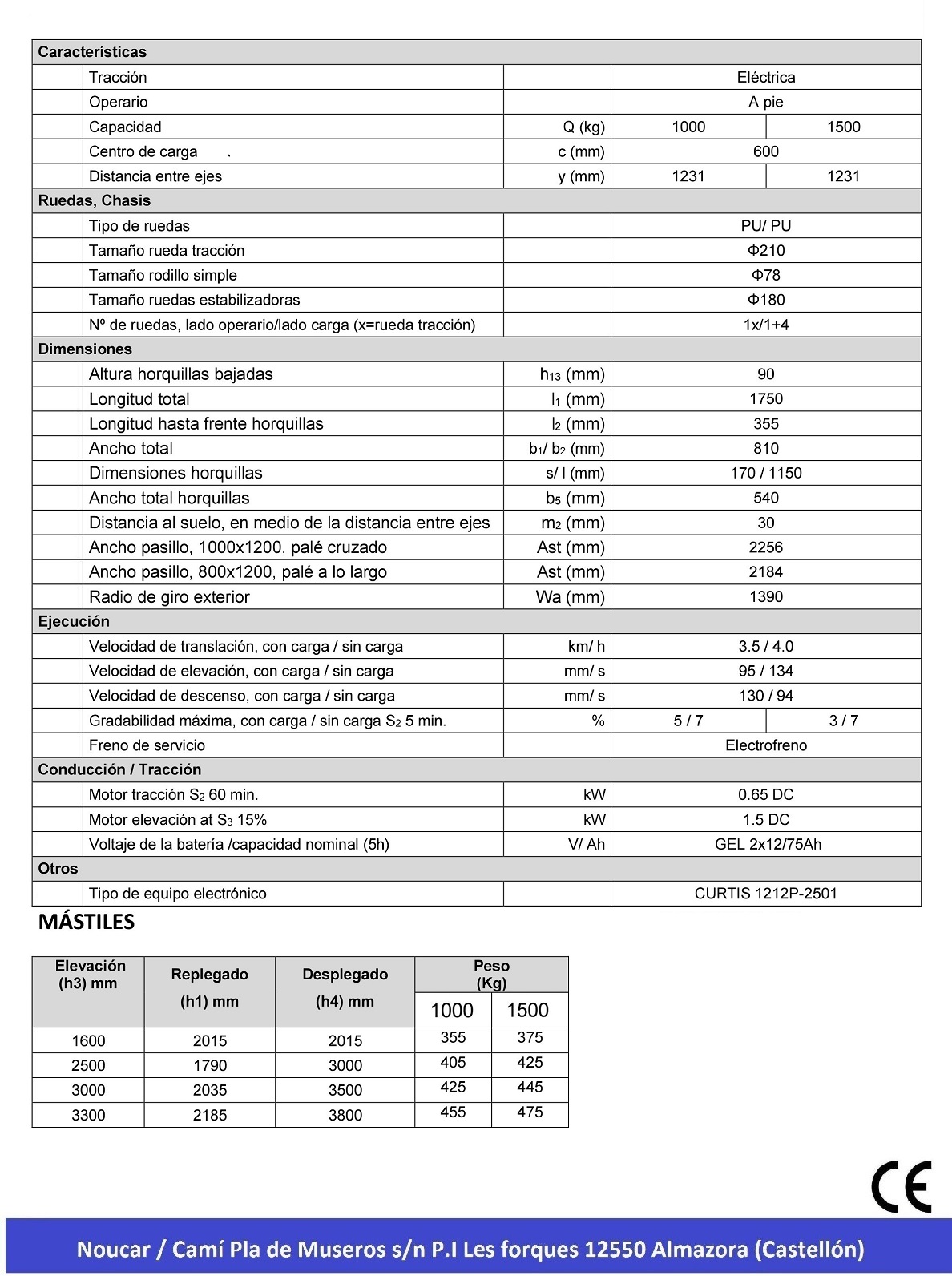 - 1.000 kg. capacidad de carga - altura: 1.660 mm. - tracción y elevación automáticas - baterías 2 x 12 V. - 75 Ah. - cargador baterías incluido - horquillas 540 x 1150 mm.