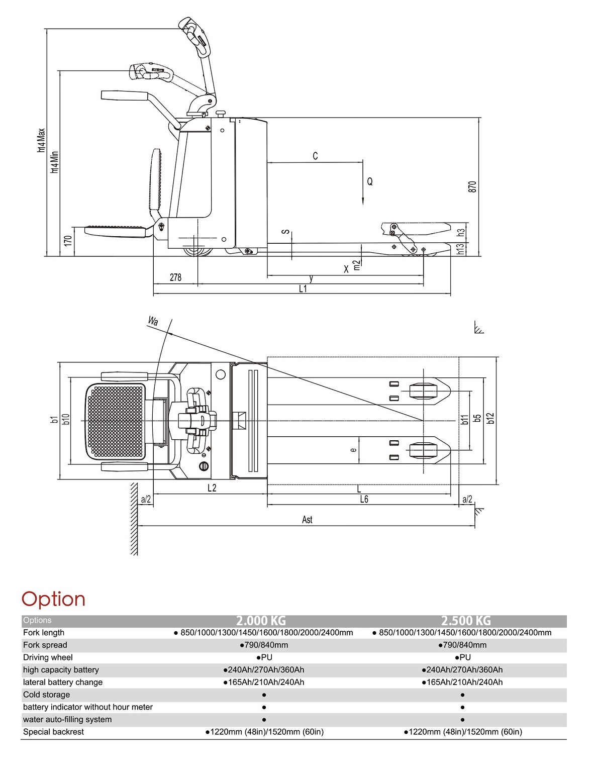 - 2.500 kg. capacidad de carga - plataforma conductor subido - corriente alterna - batería de tracción de 24 V.- 210 Ah. - cargador 24 V. 30 Ah. incluido - medidas: 1150 mm.